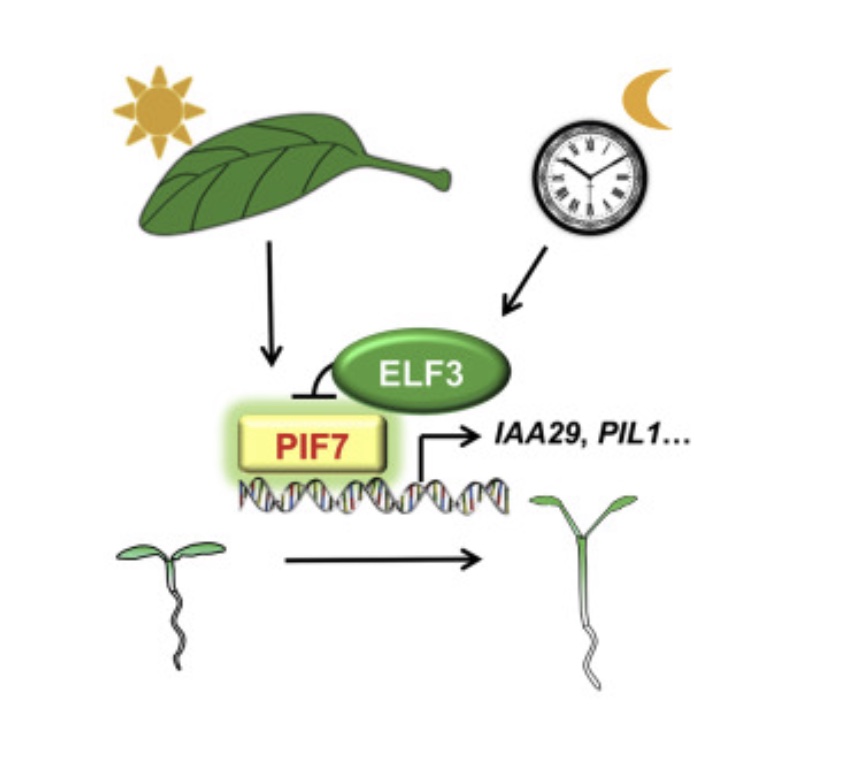 作者通过实时表型检测以及分析荫影响应基因的转录变化发现,植物对荫影的响应在“夜间”弱于“白天”,表明生物钟可能参与调控植物的避荫反应。通过对生物钟突变体在荫影下的表型筛选,作者发现生物钟核心元件ELF3在这个过程中起重要作用。进一步实验数据表明ELF3和PIF7直接互作,抑制了PIF7与下游基因的结合能力,进而调控植物避荫反应的产生。