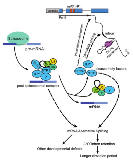 作为剪接复合体解离因子,ILP1和NTR1协助PRP43参与套索RNA和U2/5/6 snRNA从剪接位点上解离。ILP1和NTR1可通过miRNA途径依赖和非依赖的方式调控植物发育。一方面,ILP1和NTR1调控部分编码基因的可变剪接;另一方面,ILP1和NTR1通过促进MIRNA基因的转录延伸及影响一些miRNA前体分子的可变剪接进而调节miRNA的生物合成。