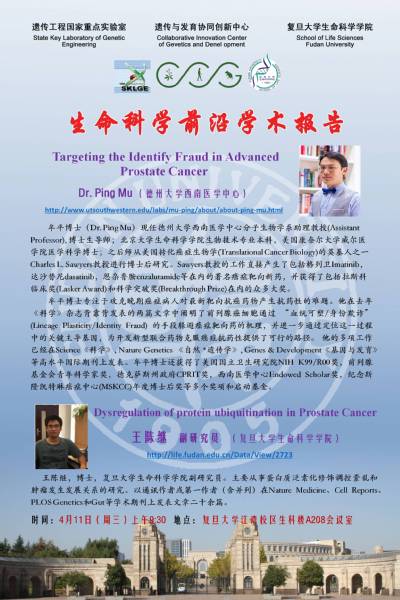 生命科学学术前沿讲坛报告20180411:牟平博士(美国德州大学西南医学中心)& 王陈继副研究员(复旦大学生科院)
