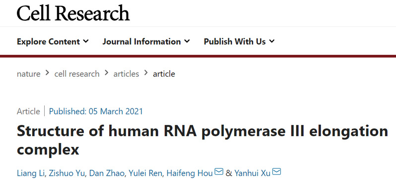 徐彦辉团队揭示人源RNA 聚合酶 III转录延伸复合物的结构和转录调控机制