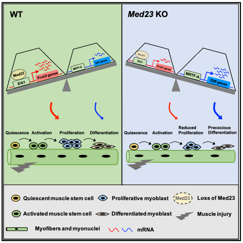 王纲团队发现转录中介体Med23亚基作为肌肉干细胞增殖和分化的分子开关,调控肌肉再生及损伤修复