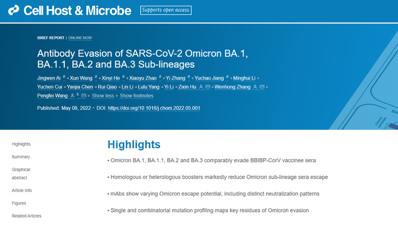 Cell Host & Microbe|王鹏飞/张文宏/胡子欣团队评估奥密克戎多种亚型毒株的免疫逃逸能力