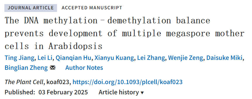2025年2月3日,郑丙莲课题组在The Plant Cell在线发表了题为“The DNA methylation–demethylation balance prevents development of multiple megaspore mother cells in Arabidopsis”的研究论文。该研究观察了拟南芥胚珠整个发育过程中不同细胞的DNA甲基化水平的时空变化,揭示了DNA甲基化水平的稳态维持是阻止周围体细胞向大孢子母细胞转变的前提条件。