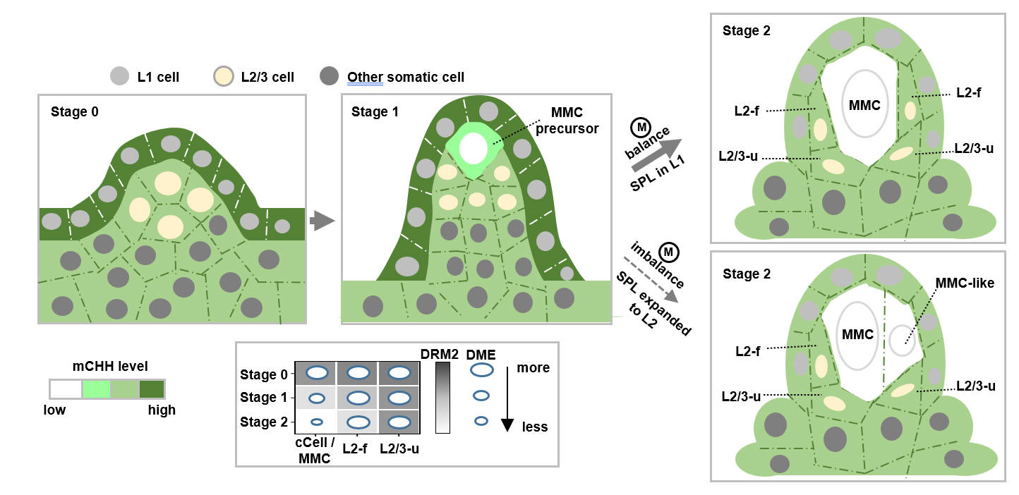 图注:在胚珠发育早期,胚珠的表皮下细胞的mCHH相对水平没有明显差异。随着胚珠的发育,位于最顶端最中央的亚表皮细胞的mCHH水平开始下降,与周围体细胞出现明显差异。当MMC确定后其mCHH水平降低到几乎检测不到的水平。此时DNA甲基化失调的突变体中,部分邻近MMC的体细胞的mCHH水平下降到类似MMC的较低水平,随后可能发育成额外的MMC。DNA甲基化水平的相对平衡可能通过限制与生殖细胞形成相关的先锋因子SPL的表达位置保证一个胚珠中只形成一个MMC。