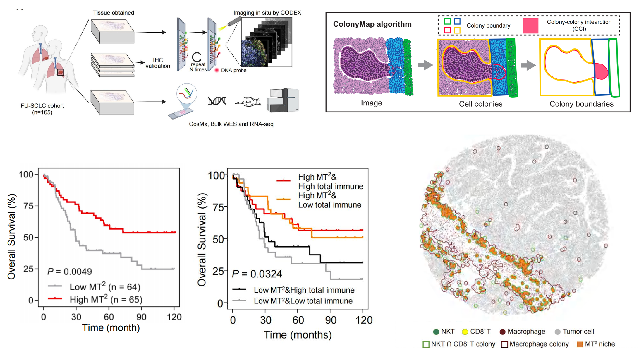 2025年2月20日,我室曹志伟教授团队与陈海泉教授团队联合在《Cancer Cell》杂志在线发表题为”Integrative Spatial Analysis Reveals Tumor Heterogeneity and Immune Colony Niche Related to Clinical-outcomes in Small Cell Lung Cancer”的论文。该研究通过整合空间多组学(CODEX、CosMx)和传统组学技术,系统性构建SCLC空间单细胞图谱,并从细胞互作生态学视角,创新性开发ColonyMap算法,揭示肿瘤内部高度分子异质性,发现与免疫疗效及患者预后密切相关的 “MT2”亚组织结构。