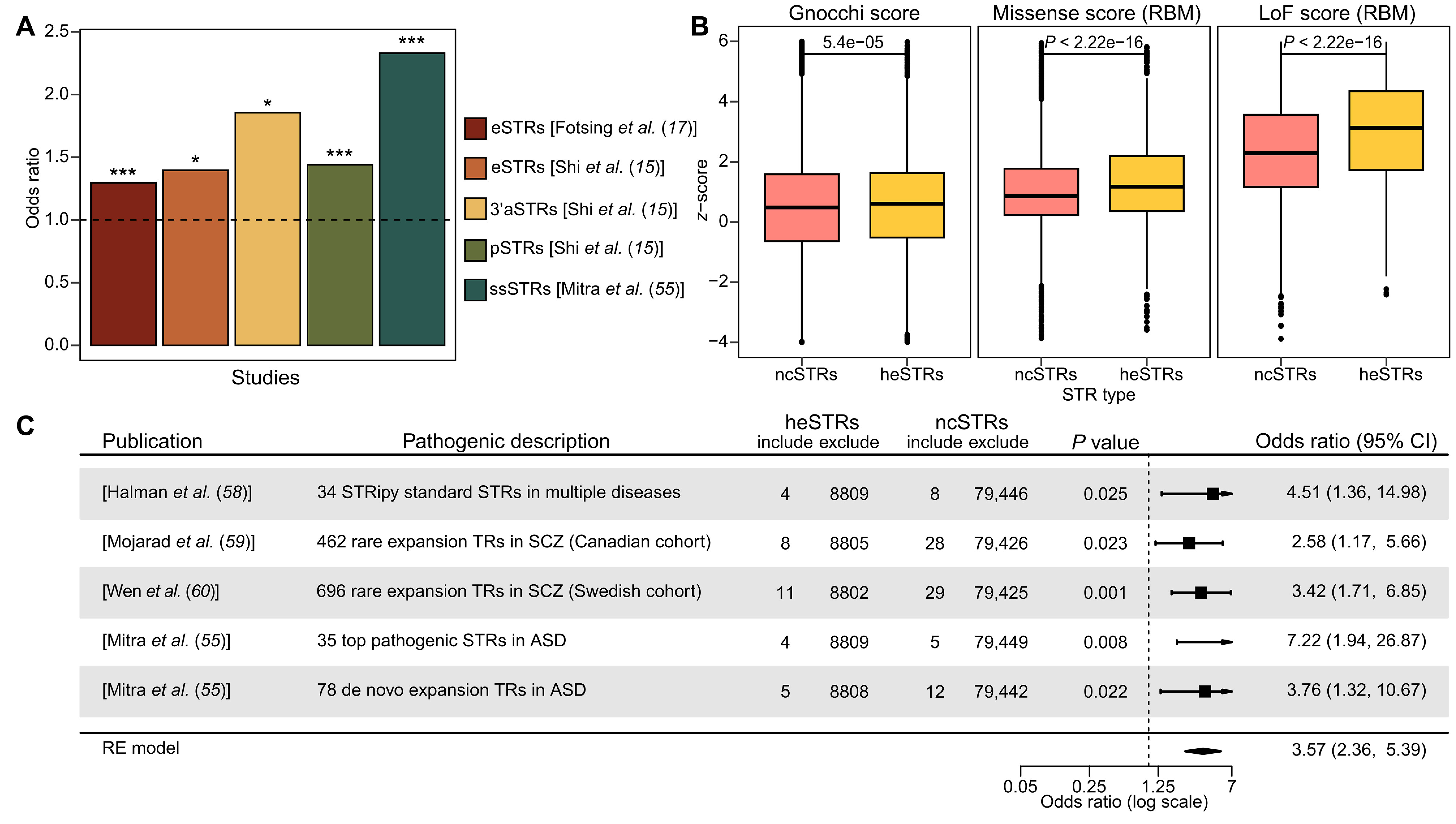 研究还发现heSTRs与多种人群层面功能性STRs存在显著关联,并且在人群中受到更强的选择约束,基因组约束评分显著高于保守型STRs,表明其功能重要性。更重要的是,heSTRs与已知的致病性STRs存在显著关联。通过与精神分裂症和自闭症队列研究中鉴定的疾病相关罕见扩增串联重复进行比较分析,发现heSTRs显著富集于这些疾病相关位点中。