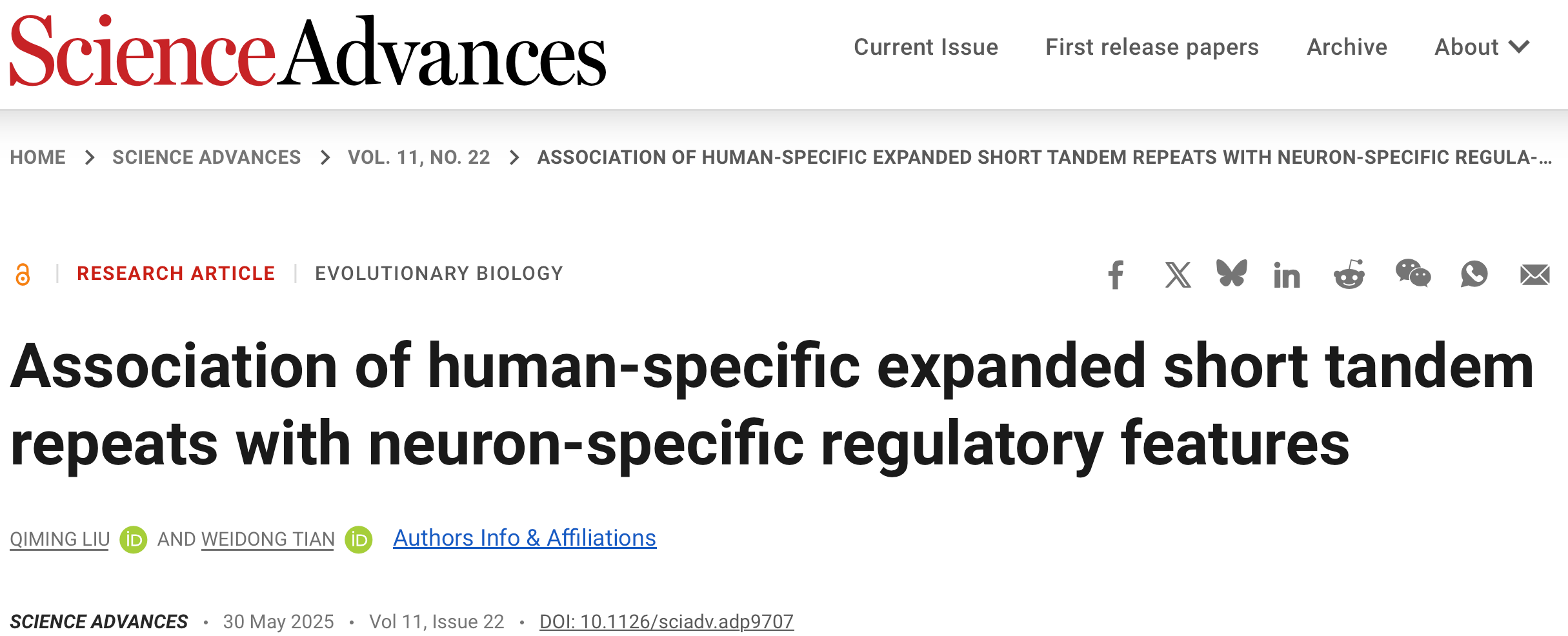 2025年5月30日,我室田卫东教授团队在Science Advances发表题为Association of human-specific expanded short tandem repeats with neuron-specific regulatory features的研究论文。该研究首次系统性地鉴定了8813个人类特异性扩增的短串联重复序列(heSTRs),并揭示了它们在神经元特异性调控中的重要作用,为理解人类大脑进化机制和神经发育疾病的遗传基础提供了全新视角。