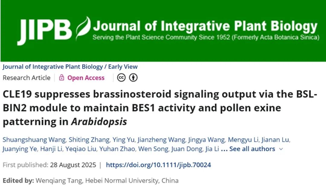 花粉是植物的雄配子体,而有活力的花粉是维持植物繁衍和作物产量的基础。近日,我室室常芳团队在JIPB在线发表了题为“CLE19 Suppresses Brassinosteroid Signaling Output via the BSL-BIN2 Module to Maintain BES1 Activity and Pollen Exine Patterning in Arabidopsis ”的研究论文。该研究定义了一个全新的双信号机制,小孢子来源的 CLE19 小肽信号与绒毡层细胞的BR激素信号通过拮抗作用形成“刹车”-“油门”机制,共同保障花粉外壁(exine)的正常发育和生殖稳态。