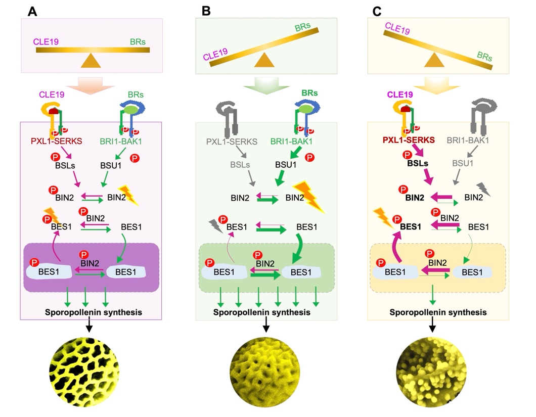图 1. CLE19 与 BR 在花粉壁发育中拮抗发挥功能。