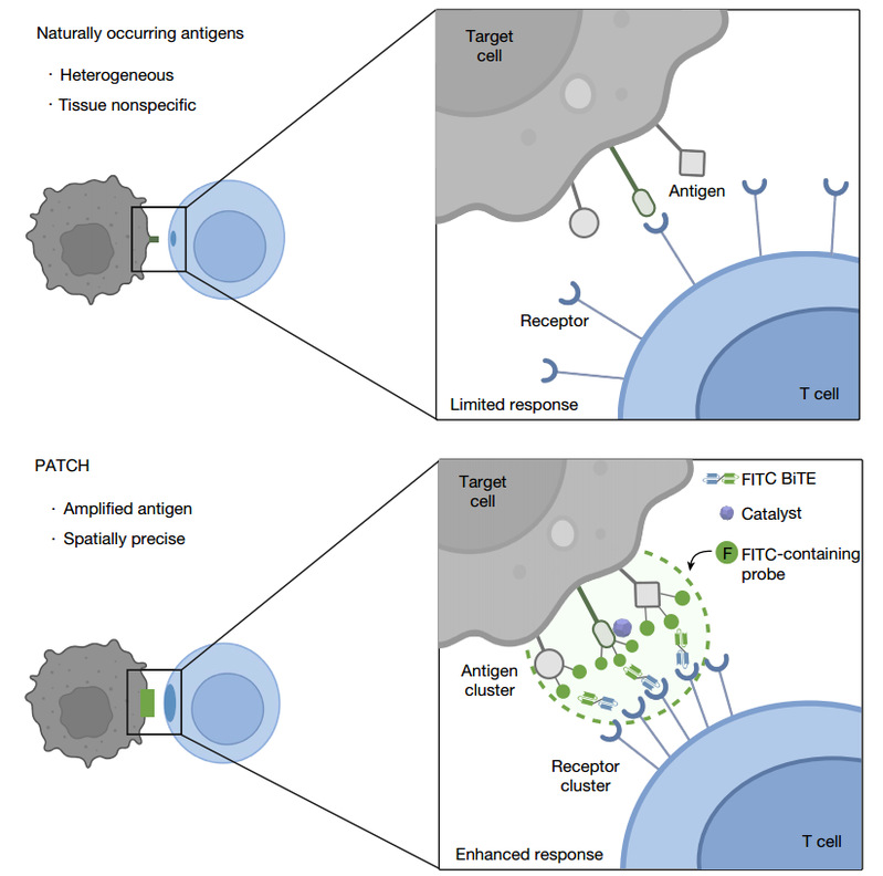 在这项研究中,研究人员提出了一种基于邻近标记化学的策略,以增强聚集诱导的受体激活,并使用TCR作为模型受体来放大下游信号传导。通过开发一种由红光(>680nm)或超声波控制的邻近标记方法,可以通过邻近扩增和标记细胞毒性半抗原(PATCH)在体内将合成抗原引入靶细胞表面。高密度的机械共价锚定PATCH引导PATCH结合双特异性T细胞接合剂(BiTE)刺激TCR聚集和T细胞毒性。体内高效的靶细胞裂解进一步诱导了对未经治疗的远端病变的脓肿反应和对再攻击的免疫记忆。这些发现证明了使用邻近标记化学来促进抗原扩增和重新编程受体簇以增强免疫细胞功能的概念。这不仅为邻近标记技术开辟了新赛道,也为抗原依赖的免疫治疗提供了新思路。