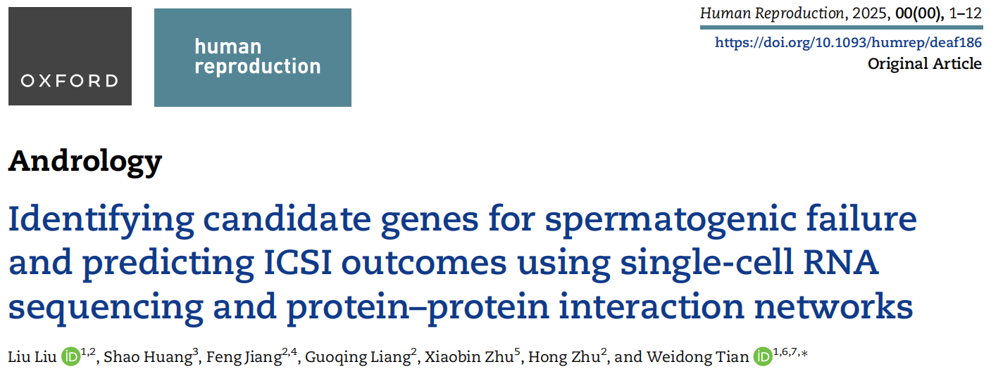 2025年10月1日,实验室田卫东教授课题组在 Human Reproduction期刊在线发表了题为 “Identifying candidate genes for spermatogenic failure and predicting ICSI outcomes using single-cell RNA sequencing and protein-protein interaction networks” 的研究论文。该研究创新性地联合单细胞转录组(scRNA-seq)与蛋白互作网络(PPI)构建机器学习框架,实现了精子发生障碍(spermatogenic failure)相关基因的系统识别及ICSI(卵胞质内单精子注射)临床结局的精准预测,为男性不育的遗传诊断和辅助生殖决策提供了全新思路。