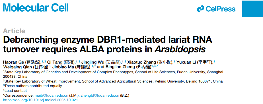 2025年11月20日,郑丙莲教授、麻锦彪教授共同在Molecular Cell发表了题为“Debranching enzyme DBR1-mediated lariat RNA turnover requires ALBA proteins in Arabidopsis”的研究论文。该研究系统地鉴定了DBR1介导的套索RNA降解的关键辅因子ALBA蛋白家族。研究结果发现ALBA蛋白通过双重机制促进套索RNA代谢:一方面增强DBR1酶活,另一方面辅助其识别套索RNA,从而维持套索RNA的代谢稳态和生物个体的正常发育。