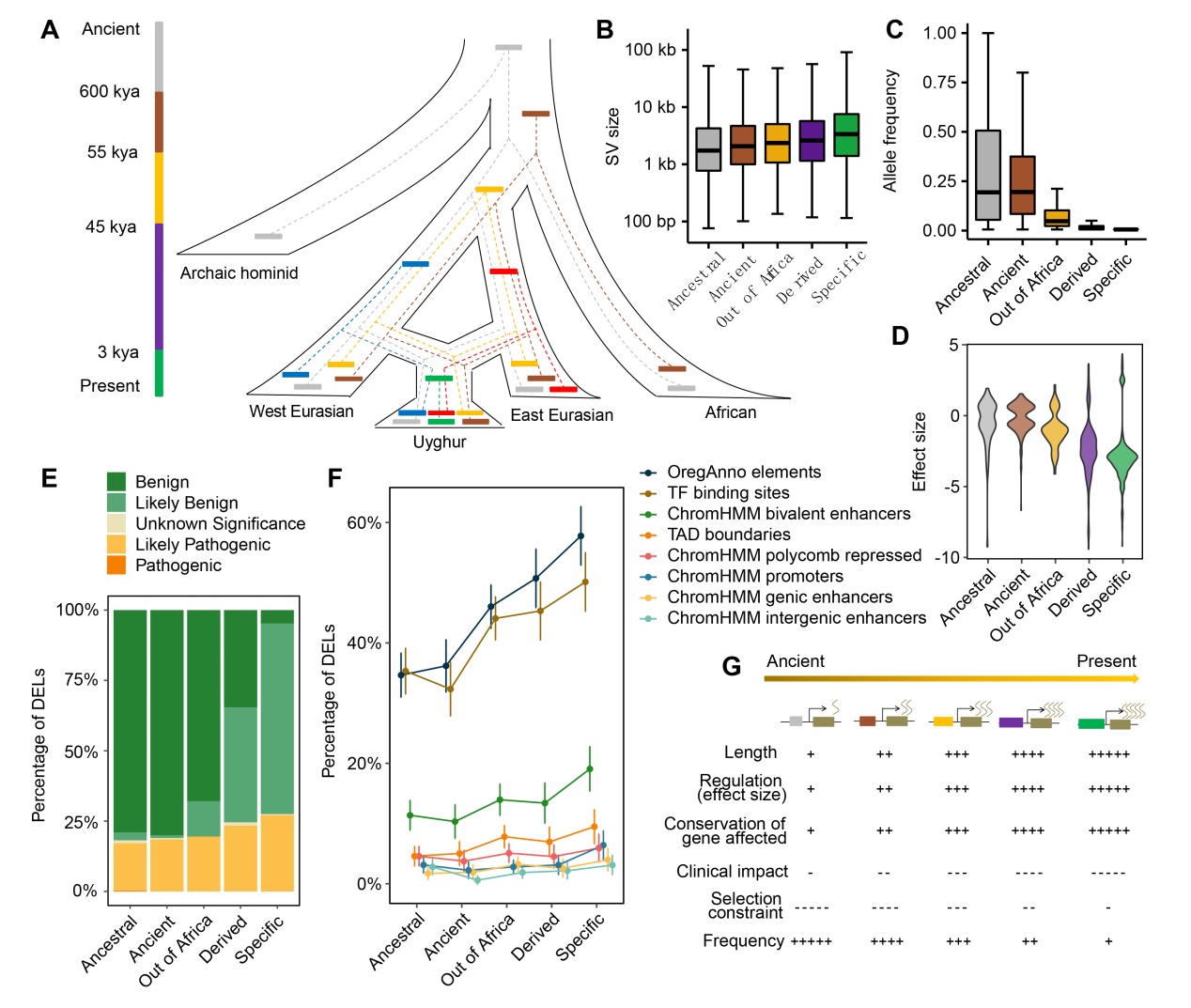 研究团队进一步根据维吾尔族与不同祖源人群之间的共享情况,将 SV归类为五类演化时期:古人类与现代人分歧之前祖先型(Ancestral)、现代人特有的古老型(Ancient)、欧亚共同的走出非洲型(Out-of-Africa)、欧亚分离后的派生型(Derived),以及维吾尔族特有的新生Specific型(图4A)。
