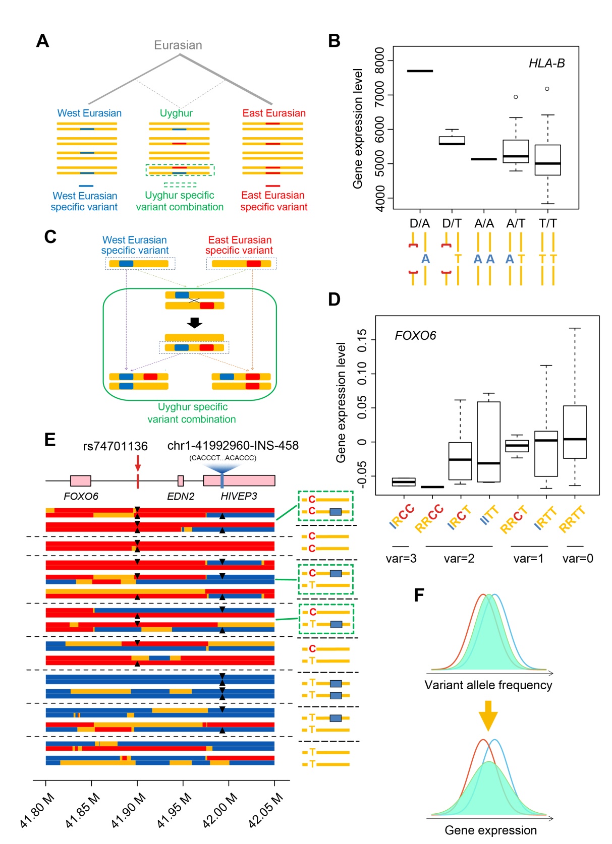 欧亚人群在走出非洲后因长期地理隔离产生了群体特异性的变异。研究发现,维吾尔族个体中同一基因区域可能同时携带来自两个祖源人群的群体特异性 SV(图3A),并且这些变异可能共同调控基因表达(图3B)。当这些位于不同区域的祖源特异性 SV在混合人群中通过重组聚集到同一条染色体后(图3C、E),进一步通过配子自由组合,能够形混合人群特有的基因型模式。关联分析显示: